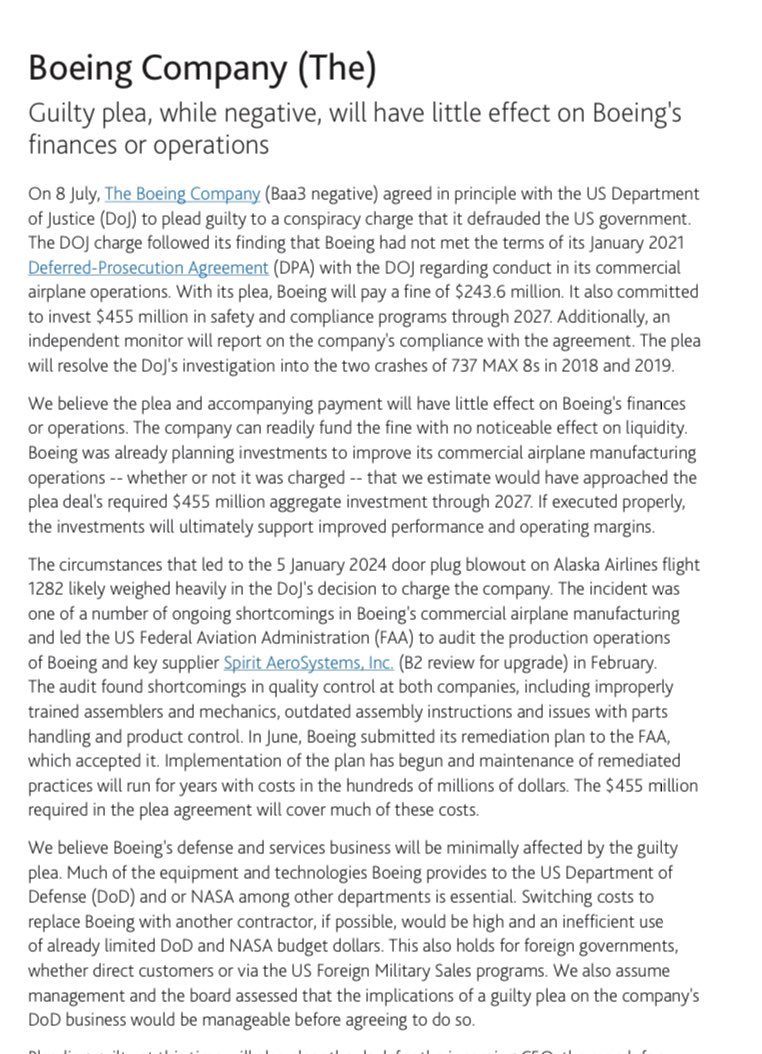 Same ol’ same ol’… a guilty plea for gub’mint PR purposes- to say “we got ’em this time”- while behind the scenes, nothing changes at Boing. I now think even another fatal Boing crash would not change anything at that malevolent company.