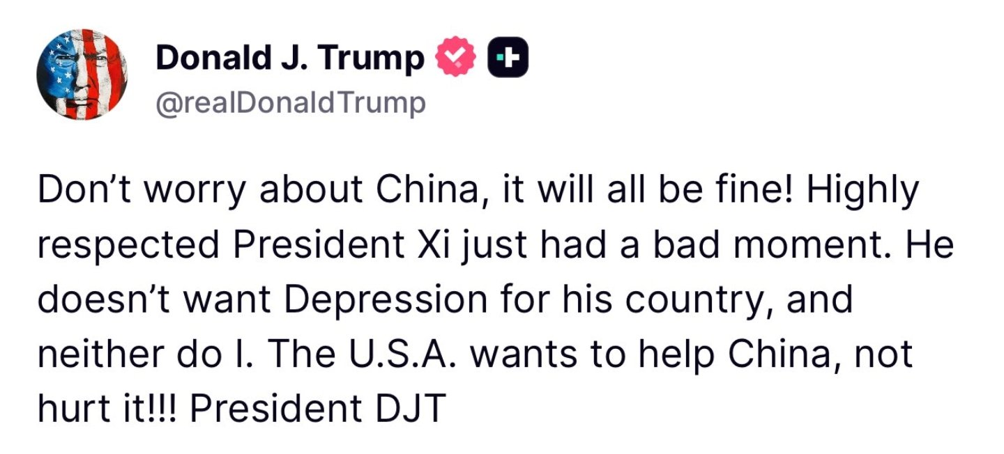 > This reflects either a humiliating loss of face, or just another cocky, unskillful commentary designed to appear to be conciliatory. But it’s unlikely that Xi will take the bait. However you interpret Trump’s message, he is almost pleading to Xi for an off-ramp.