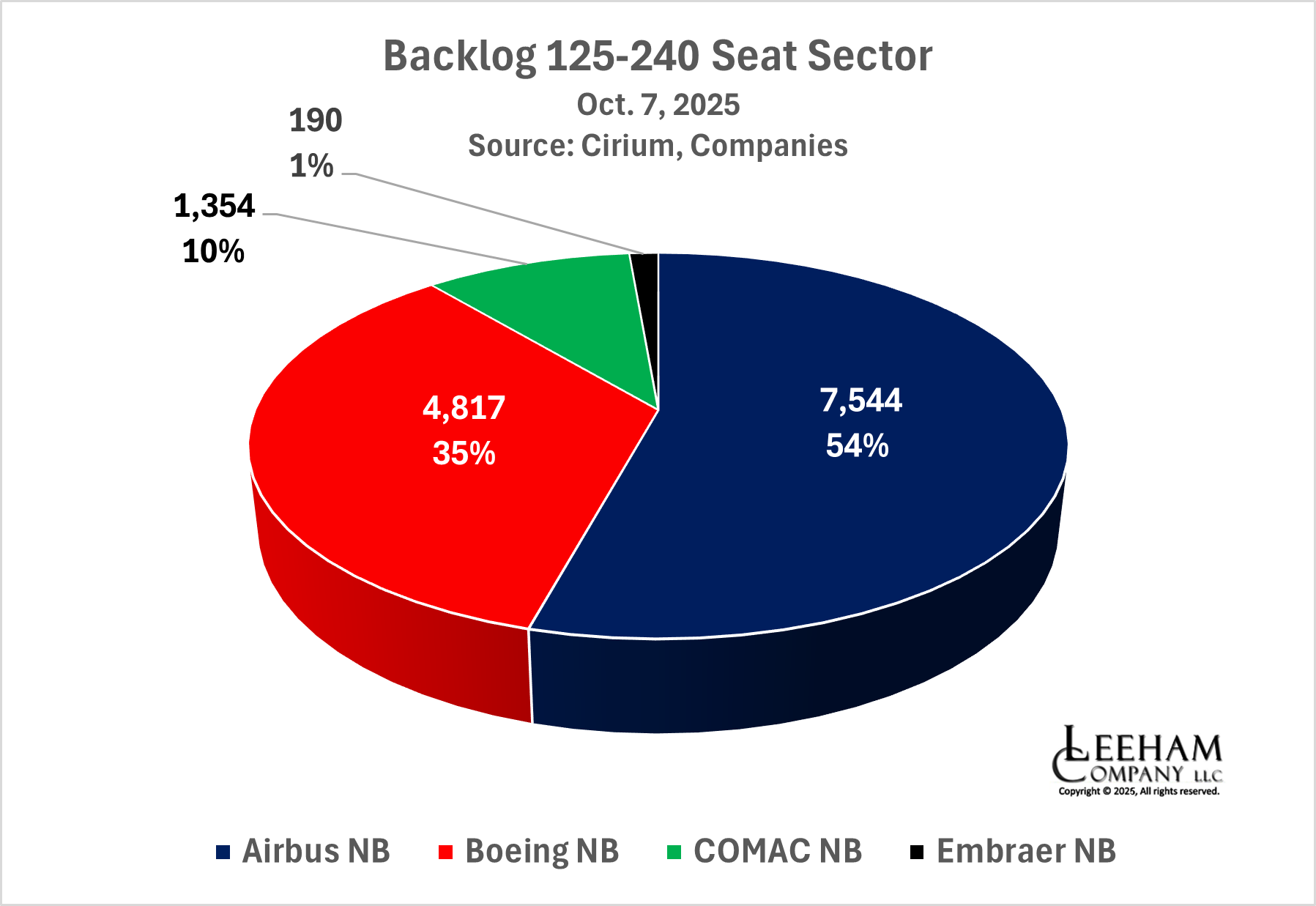 In the more crowded single-aisle 125-240 seat sector, Airbus has a 54% market share to Boeing’s 35%. China’s COMAC has a 10% share of the backlog, although its production and delivery performance is poor. Embraer’s E195-E2, has a 1% share of this sector. The E195-E2 is a 144-seat single class and 133-seat two-class airplane.