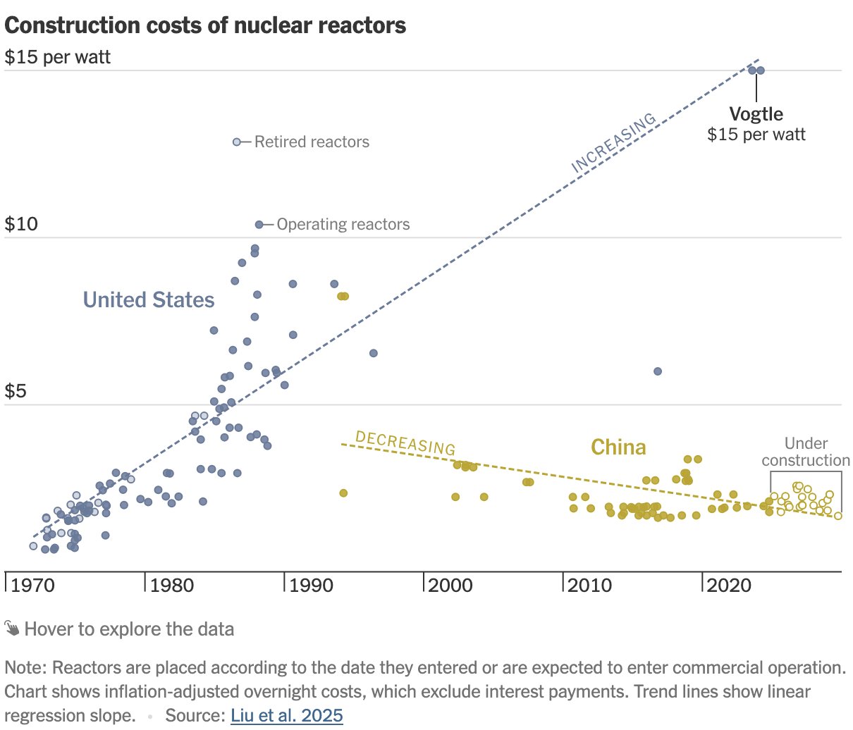 > China assembles reactors in just 5-6yrs, twice as fast as Western nations. While US nuclear construction costs skyrocketed after the 1960s, they fell by half in China during the 2000s. The only 2 US reactors built this century took 11 years & cost $35bn