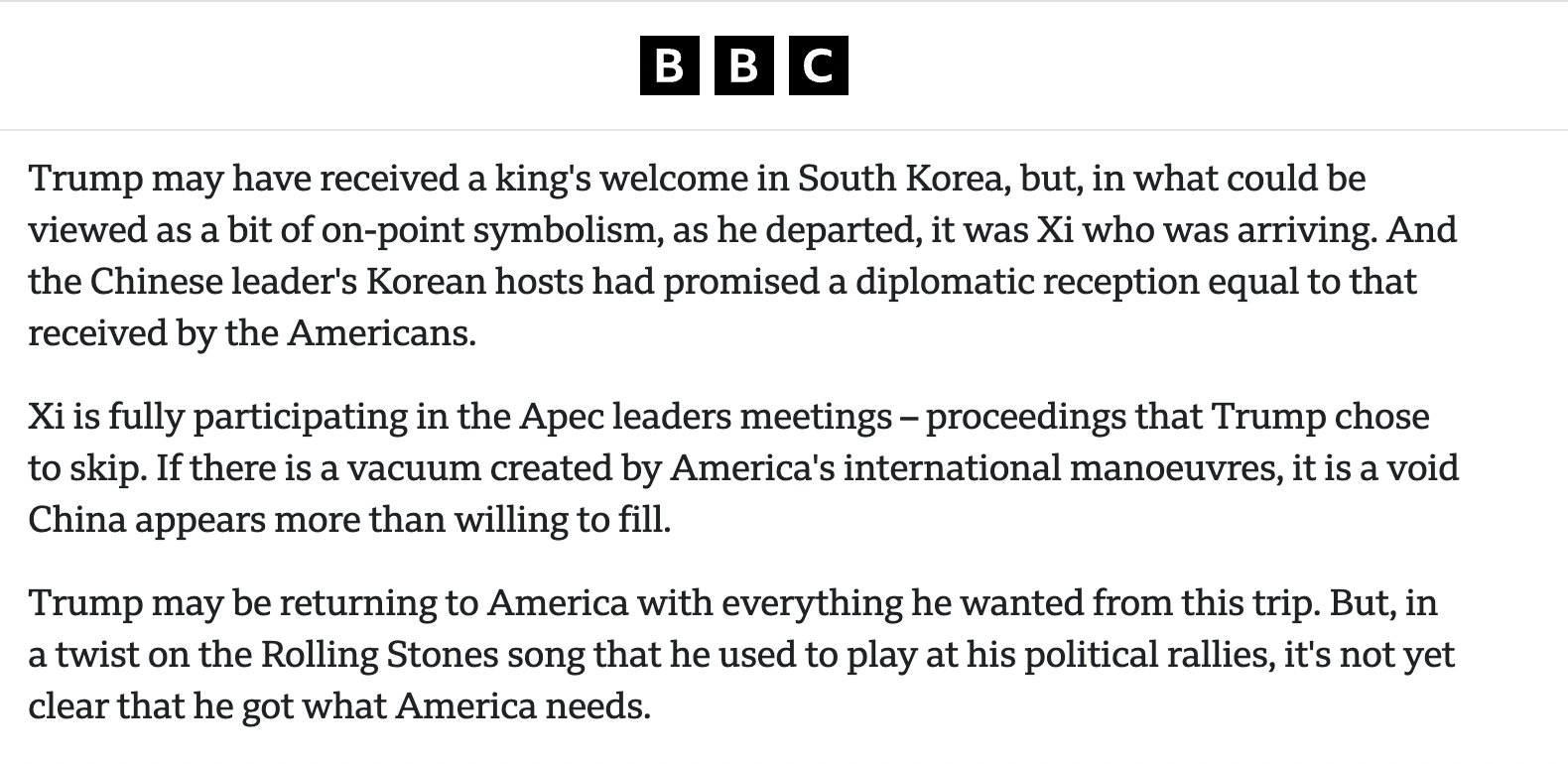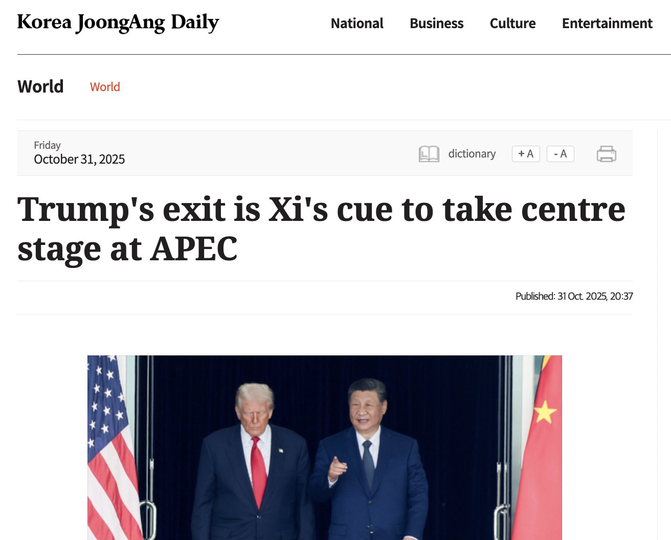 “Xi, who did not directly mention the U.S. or tariffs, shared five suggestions for cooperation at the APEC summit: safeguarding the multilateral trading system, creating an open economic environment, maintaining supply chain stability, promoting green and digital trade and fostering inclusive development.”