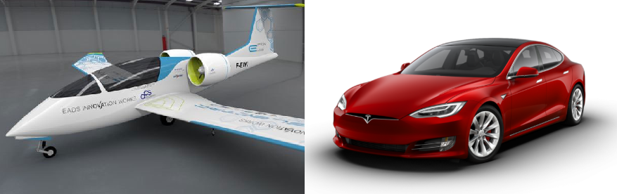 Figure 1. The battery-electric aircraft demonstrator and the car that started it all. Credit: Airbus and Tesla Inc.