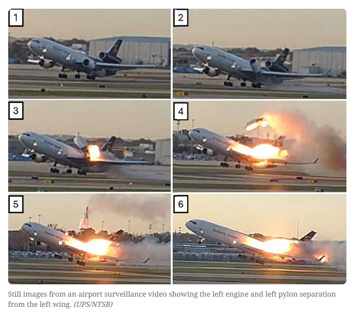 Nov. 20, 2025, (c) Leeham News: The National Transportation Safety Board (NTSB) released its preliminary report of the UPS Boeing MD-11F accident of Nov. 4 in Louisville (KY). Included are photos of the dramatic moment the No. 1 engine separated from the airplane, which had just lifted off on take-off.