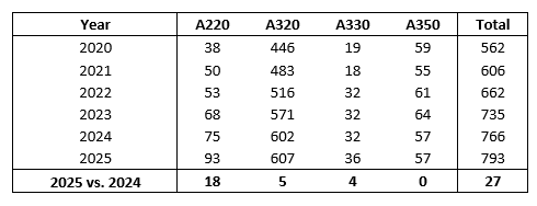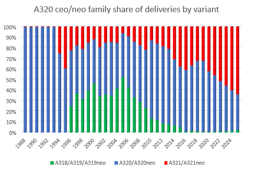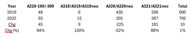 A220 and A321 deliveries almost doubled, while A320 deliveries were more than halved (the A319 does not matter).