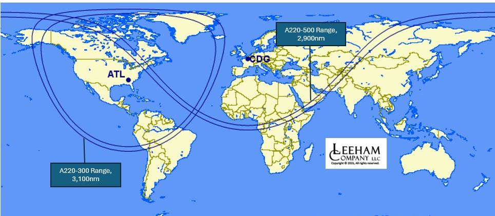 Figure 2: The ranges of the A220-300 and the proposed A220-500, using airline rules and calculated by LNA's Aircraft Performance and Cost Model (APCM). Air France (CDG) and Delta Air Lines (ATL) have expressed interest in a stretched A220-300. Credit: Leeham News.