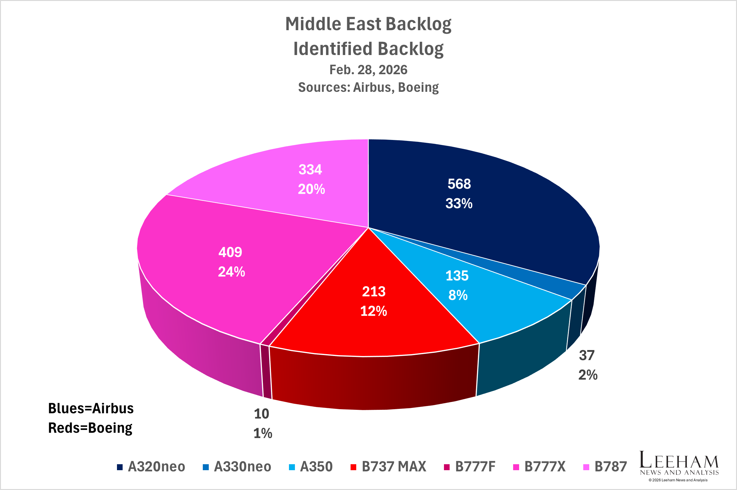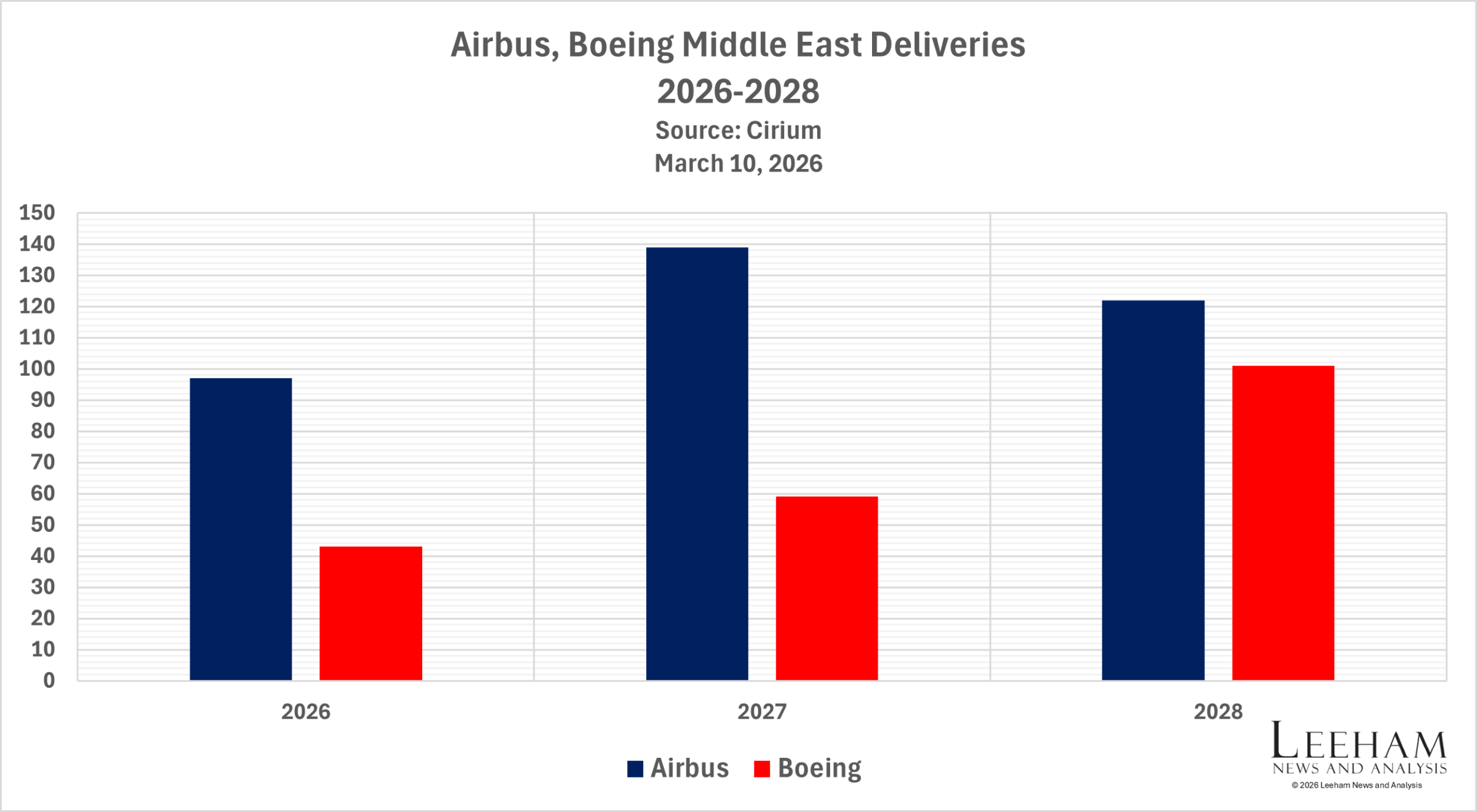 Figure 3. The Airbus-Boeing delivery stream at risk for the Middle East. Data Source: Cirium. Analysis by Leeham News.