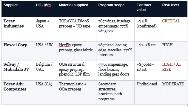 The composite materials supply chain for both programs flows through a remarkably narrow set of chokepoints. At the apex sits Toray Industries of Japan, which holds a supply agreement with Boeing valued at approximately $11bn across the 787 and 777X contract period, confirmed in Toray’s own investor disclosures. Below Toray in the Boeing hierarchy sit Hexcel Corp, the Connecticut-based materials specialist, and Solvay of Belgium, operating through a joint venture with Abu Dhabi’s Mubadala Development Co. These three entities supply the prepreg and unidirectional tape that forms the structural backbone of both aircraft.