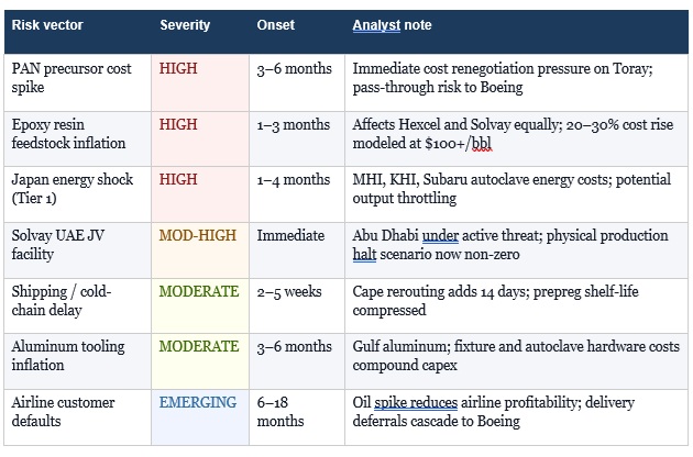 For the 787, the most immediate concern is not material availability per se. Toray maintains inventory buffers at its Tacoma (WA) and Spartanburg (SC) facilities, which are geographically insulated from the Gulf crisis.