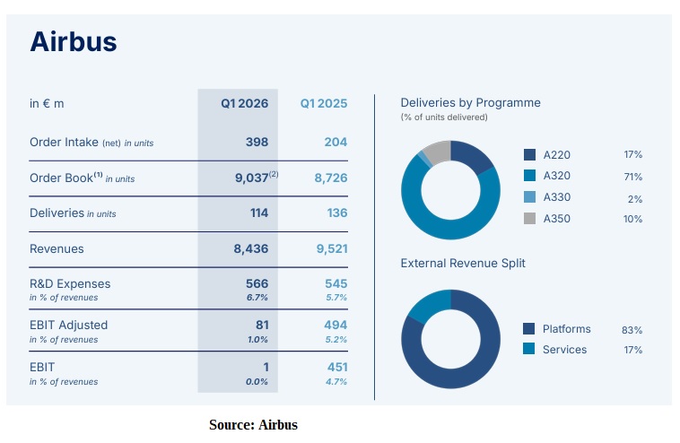 Revenues at Airbus Commercial declined €1.085bn in 1Q2026, year-over-year. This was driven by the “de-synchronization” between production and delivery, with the company unable to handover aircraft to customers and the resulting build-up of inventory waiting for delivery.