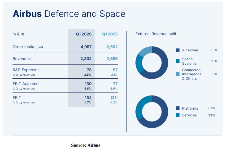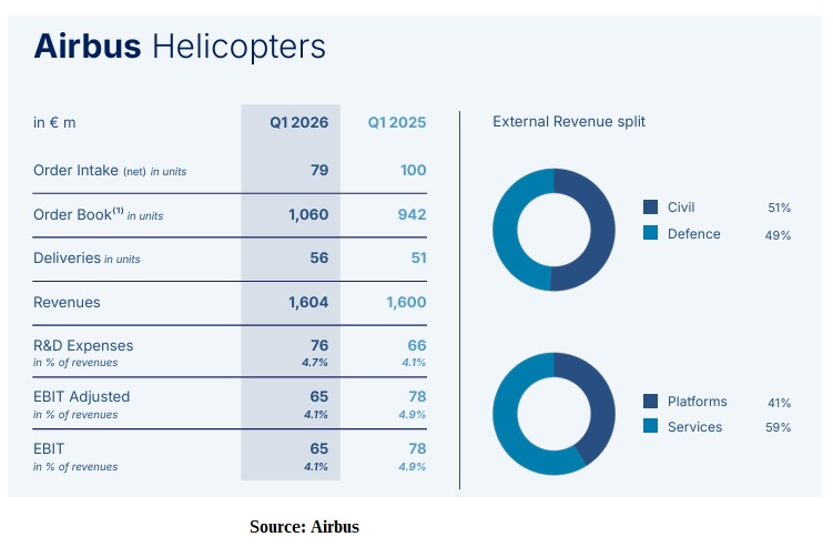 Revenues at Helicopters leveled out through the first quarter (€1.604bn vs €1.6bn in 1Q2025), with EBIT adjusted dipping to €65m and a 4.1% margin (€78m and 4.9% in 1Q2025).